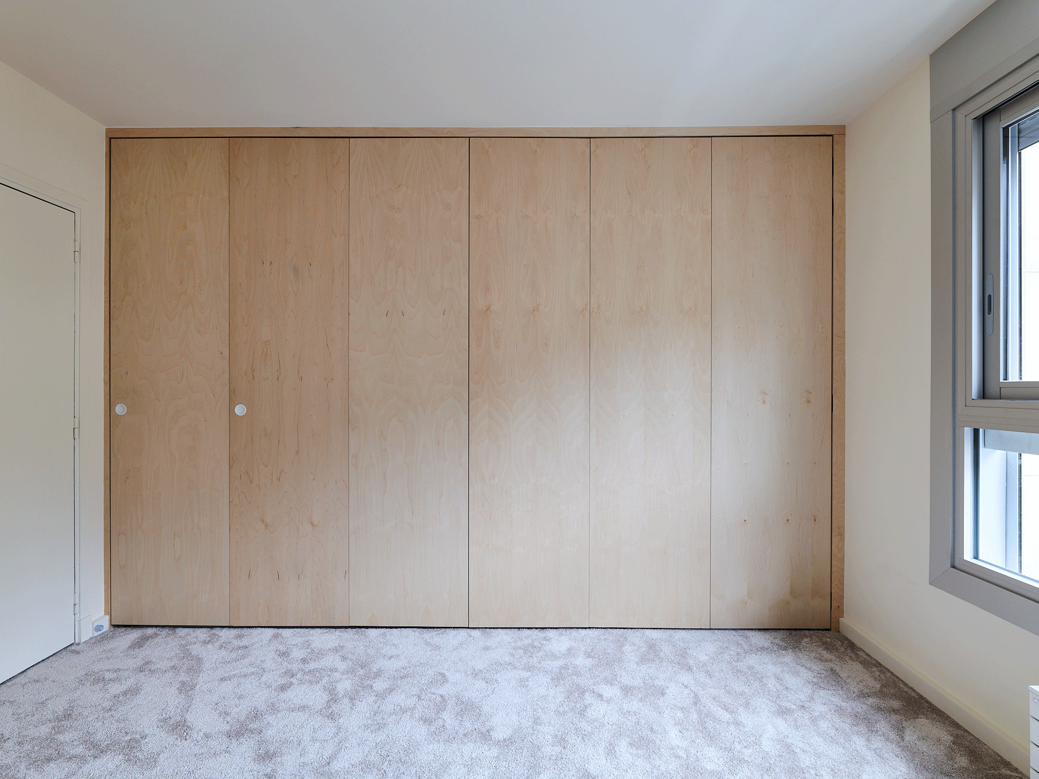 Le plan d'origine de cet appartement était onctradictoire avec la demande de la commanditaire : créer une chambre supplémentaire à partir de celle de sa fille, afin de pouvoir accueillir des invités sans compromettre la tranquillité de l’enfant. De cette contrainte est né un système modulaire, décliné dans les mêmes finitions que le bureau et la salle de bain attenante, afin de préserver une homogénéité visuelle. Ce dispositif permet non seulement d’offrir un généreux espace de jeu et de futur espace de travail, mais aussi de transformer la pièce en un véritable coin nuit lorsqu’il s’agit d’accueillir ponctuellement famille ou amis de passage.